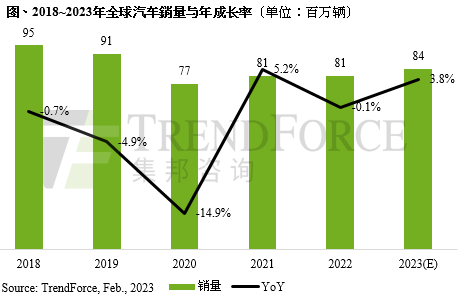 依据TrendForce集邦咨询发布的统计数据,2022年全球轿车销量为8105万辆,年阑珊0.1%,与2021年销量简直相等,预估2023年全球轿车商场销量有时机康复增加态势,达8410万辆,年增3.8%。