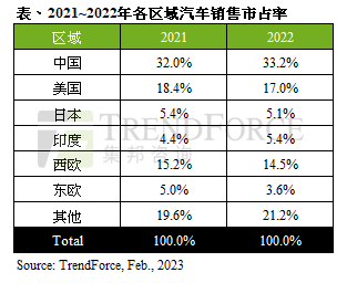 TrendForce集邦咨询数据显现,2022年我国全年轿车销量为2690万辆,年增3.7%,是支撑全球新车商场的要害。美国和西欧销量均创下十年来前史新低,美国总量仅到达1370万辆,年阑珊8.1%;西欧仅1180万辆,年阑珊4.6%。而俄罗斯因俄乌抵触影响,新车销量年减100万辆,而东欧商场销量也因而呈现年减27.3%。但新式商场体现杰出,如印度销量在2022年首度以430万辆替代日本成为全球第三大轿车商场;印尼则是在连两年生长后回到疫情前水平。